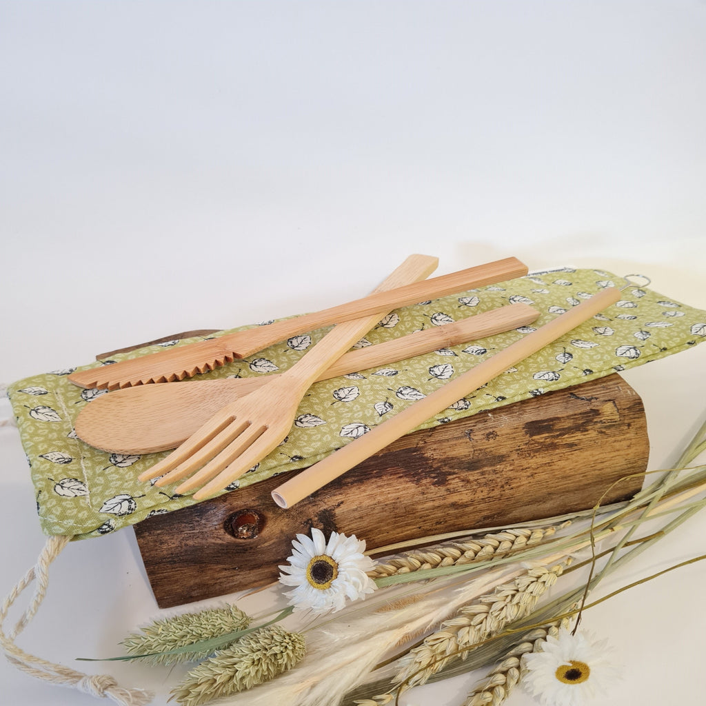 This handmade sustainable Bamboo Cutlery set in a really pretty sage green, pouch with dainty white leaves, & slightly larger white leaves with black edge detail, is perfect when your on the move, great for camping trips, lunch out or even take it on your travels, a lovely size to pop in your bag.