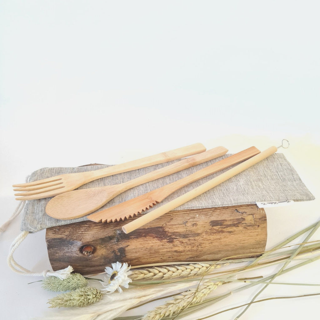 Bamboo Cutlery, Knife with serrated blade, fork, spoon, Bamboo straw cleaning brush, in 100% cotton drawstring pouch.